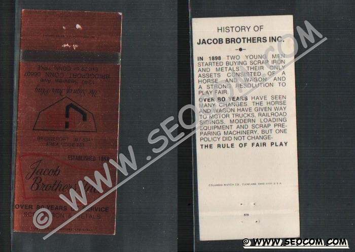 | (CT) - Bridgeport - Matchcover - Jacob Brothers Inc Scrap Iron & Metals 1240 Seaview Ave w/Co History Inside (ct_box1), (ct_mcflat1), |